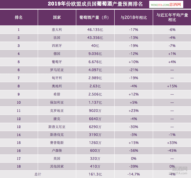 2019年預估葡萄酒產量排名前十的國家還有羅馬尼亞(4.097億升)、匈牙利(2.989億升)、奧地利(2.63億升)、希臘(2.506億升)和保加利亞(1.137億升)。