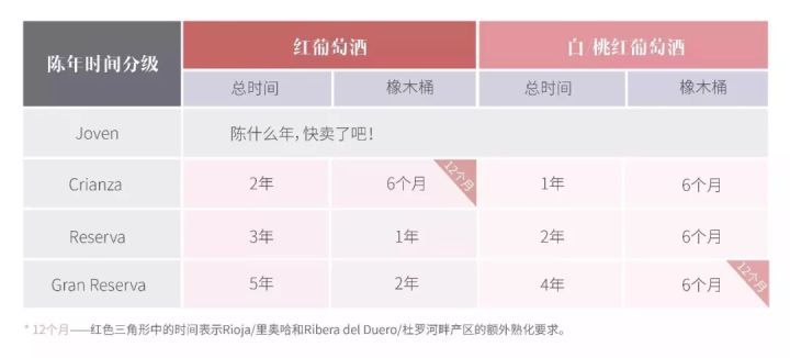 陳年時間的分級體系主要存在于里奧哈、杜埃羅河岸和納瓦拉等法定產(chǎn)區(qū),且適用于DO或DOCa葡萄酒,從低到高依次為: