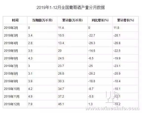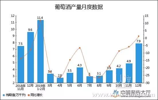 根據中國報告大廳對2019年1-12月全國葡萄酒產量進行監測統計顯示:2019年12月全國葡萄酒產量7.9萬千升,同比增長1.3%,2019年1-12月全國葡萄酒產量為45.1萬千升,累計下降10.2%。(備注:2018年1-12月全國葡萄酒產量為62.9萬千升)