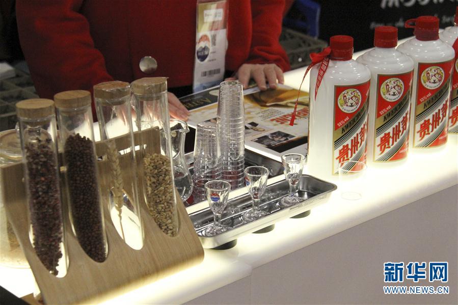 這是2月12日在法國巴黎國際葡萄酒及烈酒博覽會上拍攝的貴州茅臺酒展臺。 新華社記者 徐永春 攝