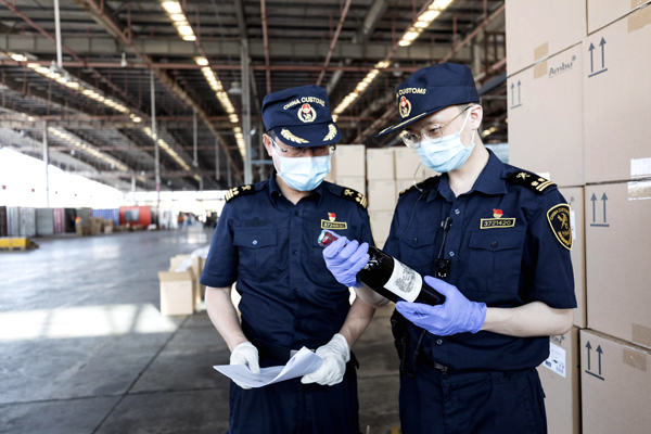 廈門海關(guān)關(guān)員驗放關(guān)區(qū)首批跨境電商渠道進口高端葡萄酒。劉超攝