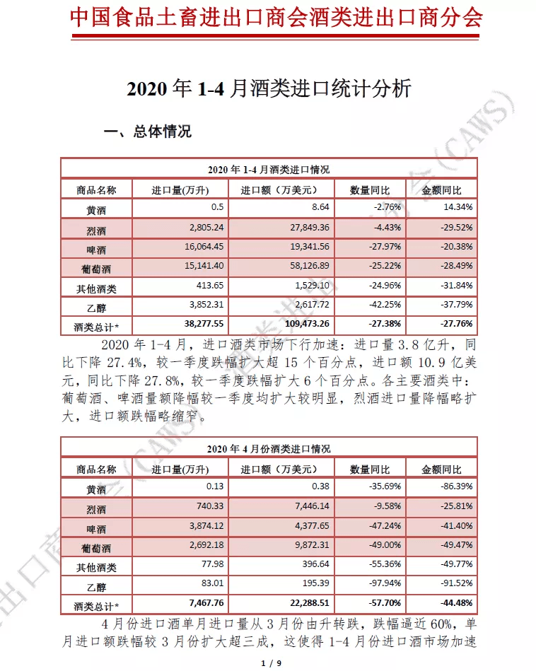 新京報訊(見習記者 鄭明珠)2020年1-4月,進口酒類市場下行加速,進口量3.8億升,同比下降27.4%,較一季度跌幅擴大超15個百分點,進口額10.9億美元,同比下降27.8%,較一季度跌幅擴大6個百分點。該數據源于6月8日中國食品土畜進出口商會酒類進出口商分會發布的《2020年1-4月酒類進口統計分析》。分析稱,各主要進口酒類中:葡萄酒,啤酒量額降幅較一季度均擴大較明顯,烈酒進口量降幅略擴大,進口額跌幅略縮窄。