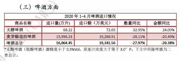 1-4月,啤酒進口量1.6億升,進口額1.9億美元,量額跌幅較一季度均擴大約一成,占酒類進口總額的17.7%。