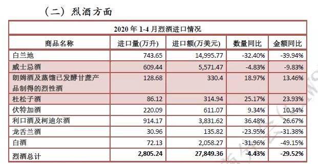 分析指出,1-4月,烈酒進口量2805萬升,維持個位數跌幅,較一季度擴大2個百分點,進口額2.8億美元,降幅較一季度回調1個百分點,占酒類進口總額的25.4%。