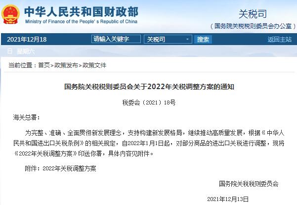 國務院關稅稅則委員會發(fā)布通知,自2022年1月1日起,對部分商品的進出口關稅進行調整 。